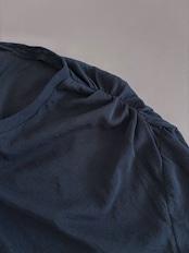 生地をバイヤス使いにして斜行を持たせたカットソー。アシンメトリーなシルエットや肩部分のギャザーがJUN MIKAMIらしい、一枚でもさまになる一枚です。