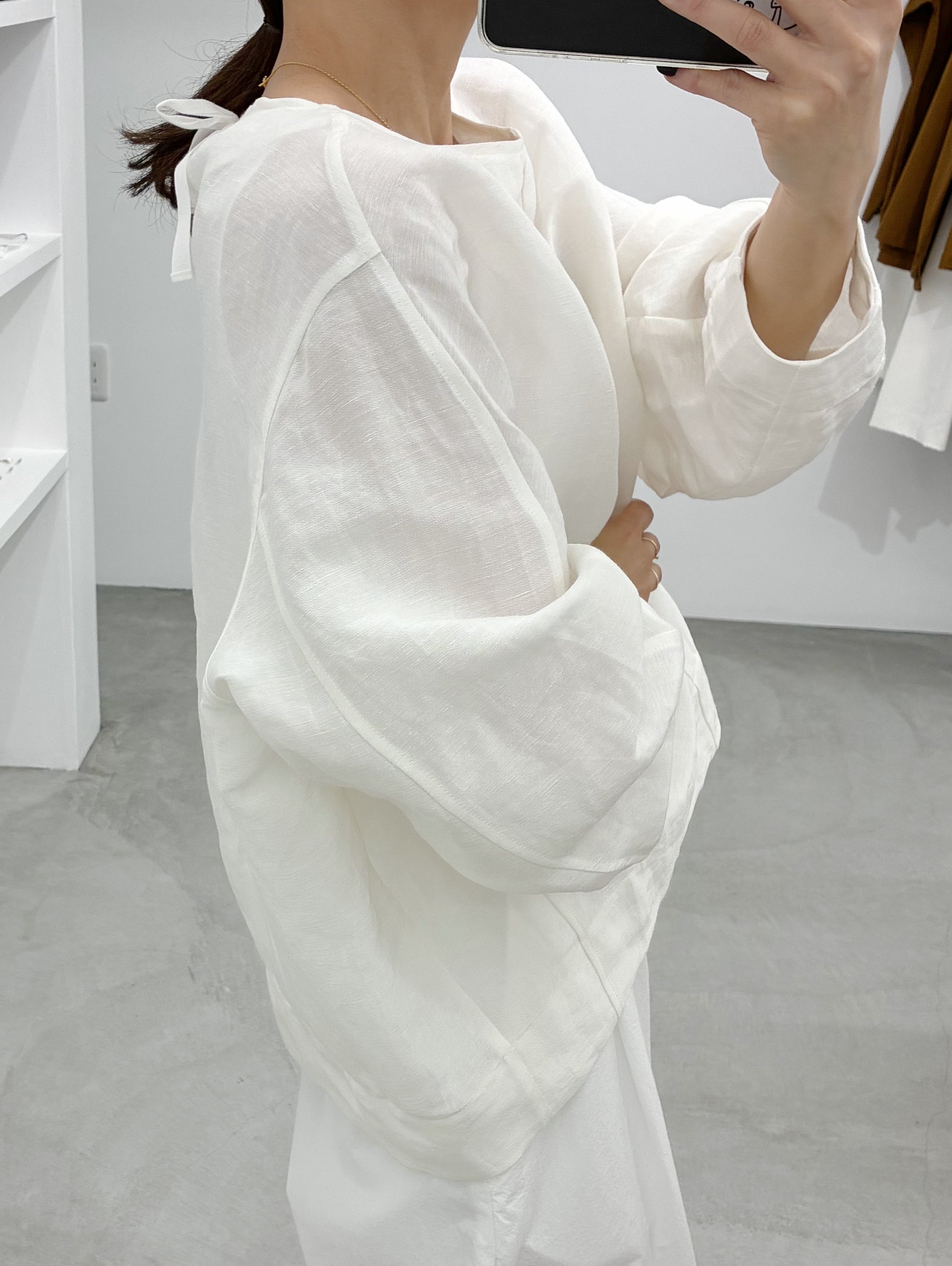 すっきりとしたきれいなネックラインで、首元後ろにはリボン。